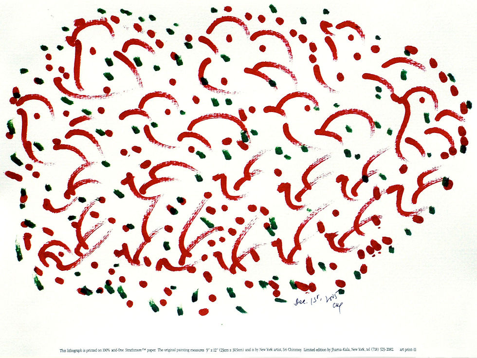 Reprodukcie meditačných obrazov Sri Chinmoya prehovárajú k človeku spontánnou a povznášajúcou súhrou farieb, ktorá ponúka hlboký zážitok harmónie, mieru a vnútornej radosti. Niektoré zachytávajú pozitívne kvality ľudského ducha, iné pomocou sýtych farieb a dynamických ťahov vyjadrujú hľadanie zmyslu života a harmónie s vesmírom. Ďalšou podobou jeho umeleckého vyjadrenia sú kresby vtáčikov, ktoré tiež nazýval „vtáčiky duše“ .…