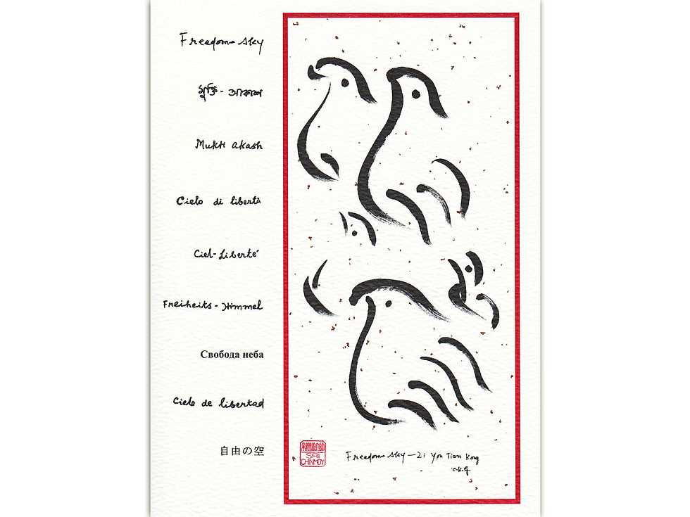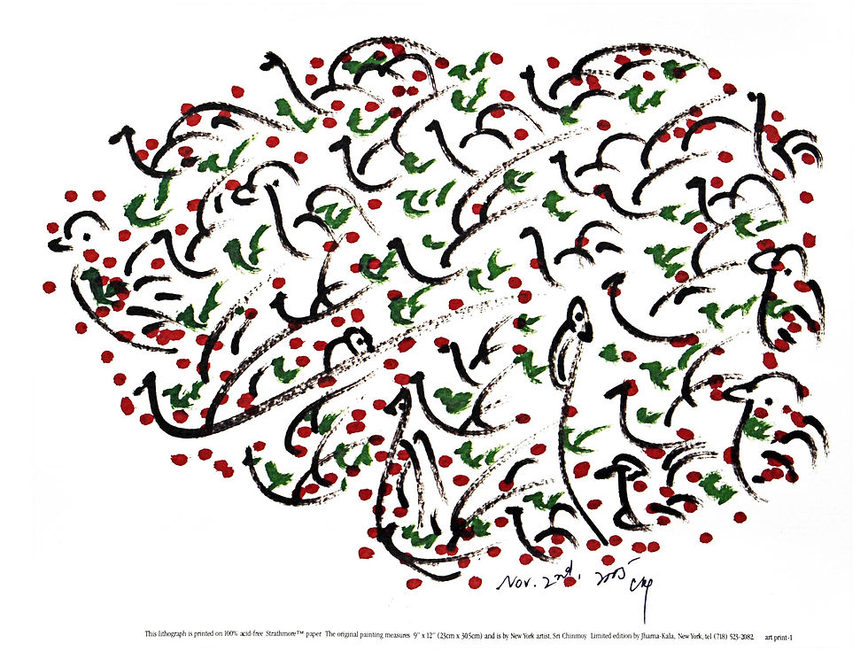 Reprodukcie meditačných obrazov Sri Chinmoya prehovárajú k človeku spontánnou a povznášajúcou súhrou farieb, ktorá ponúka hlboký zážitok harmónie, mieru a vnútornej radosti. Niektoré zachytávajú pozitívne kvality ľudského ducha, iné pomocou sýtych farieb a dynamických ťahov vyjadrujú hľadanie zmyslu života a harmónie s vesmírom. Ďalšou podobou jeho umeleckého vyjadrenia sú kresby vtáčikov, ktoré tiež nazýval „vtáčiky duše“ .…